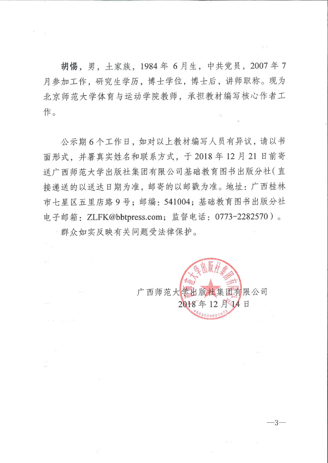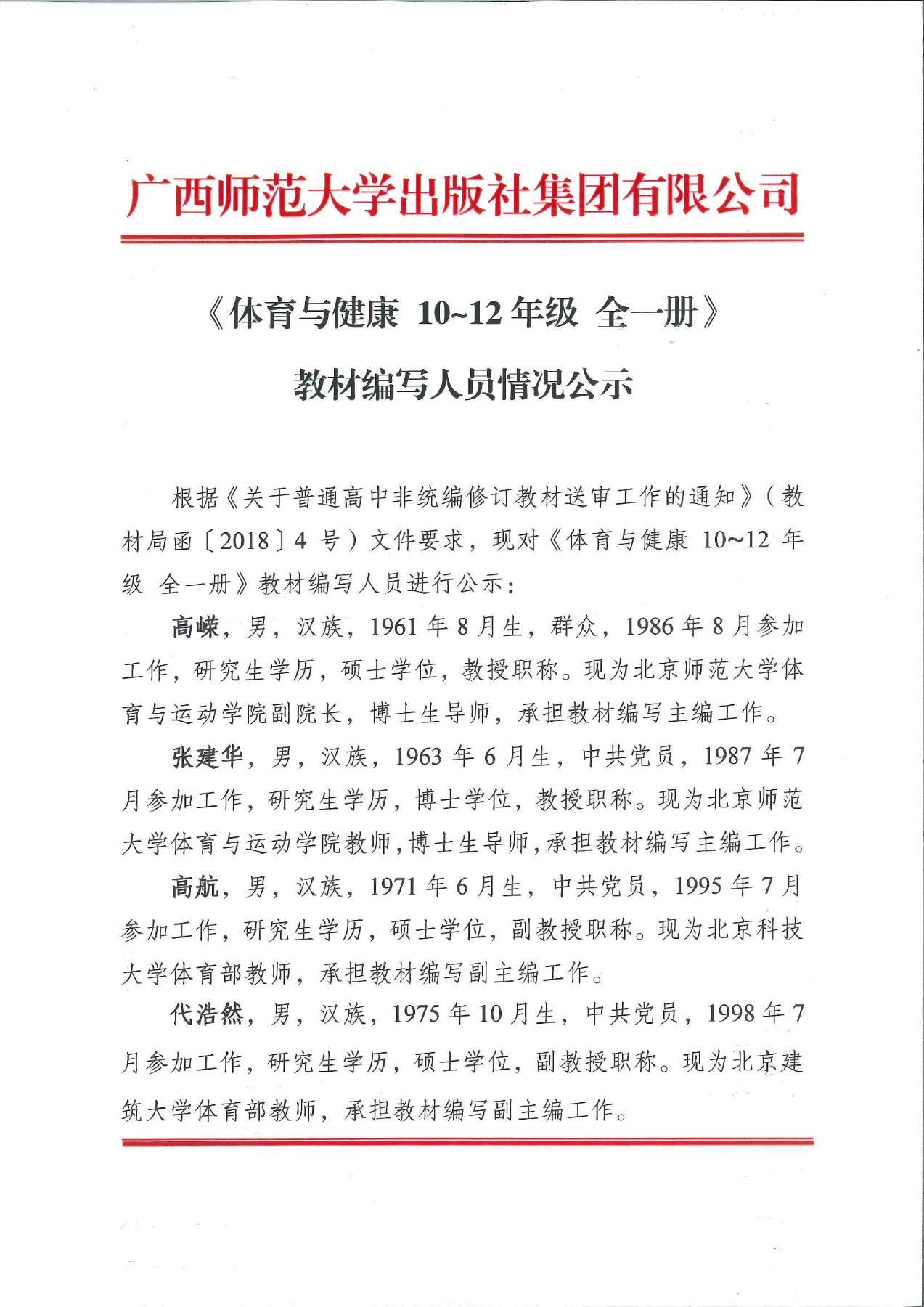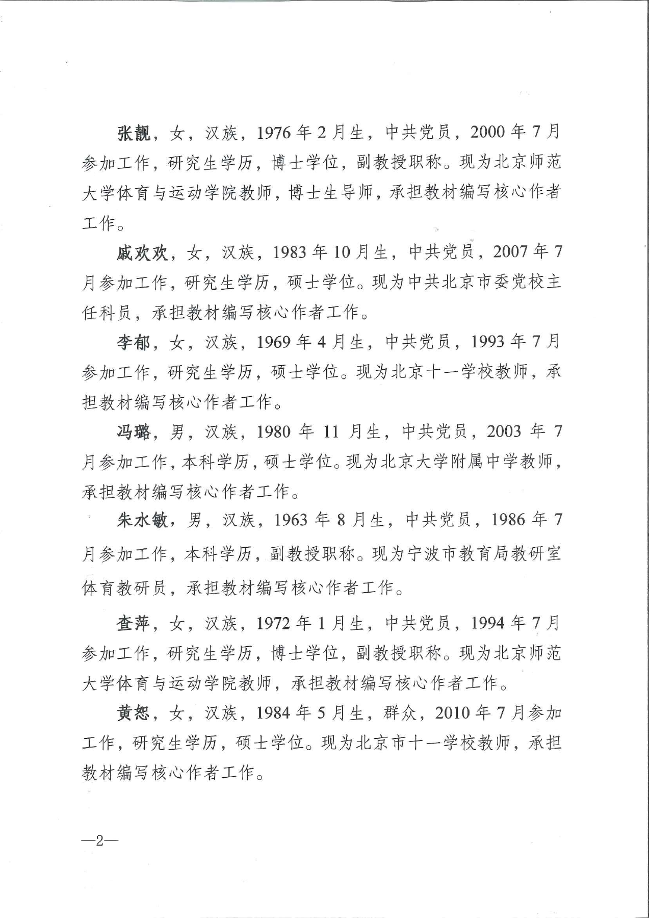 《體育與健康 10~12年級 全一冊》教材編寫(xiě)人員情況公示