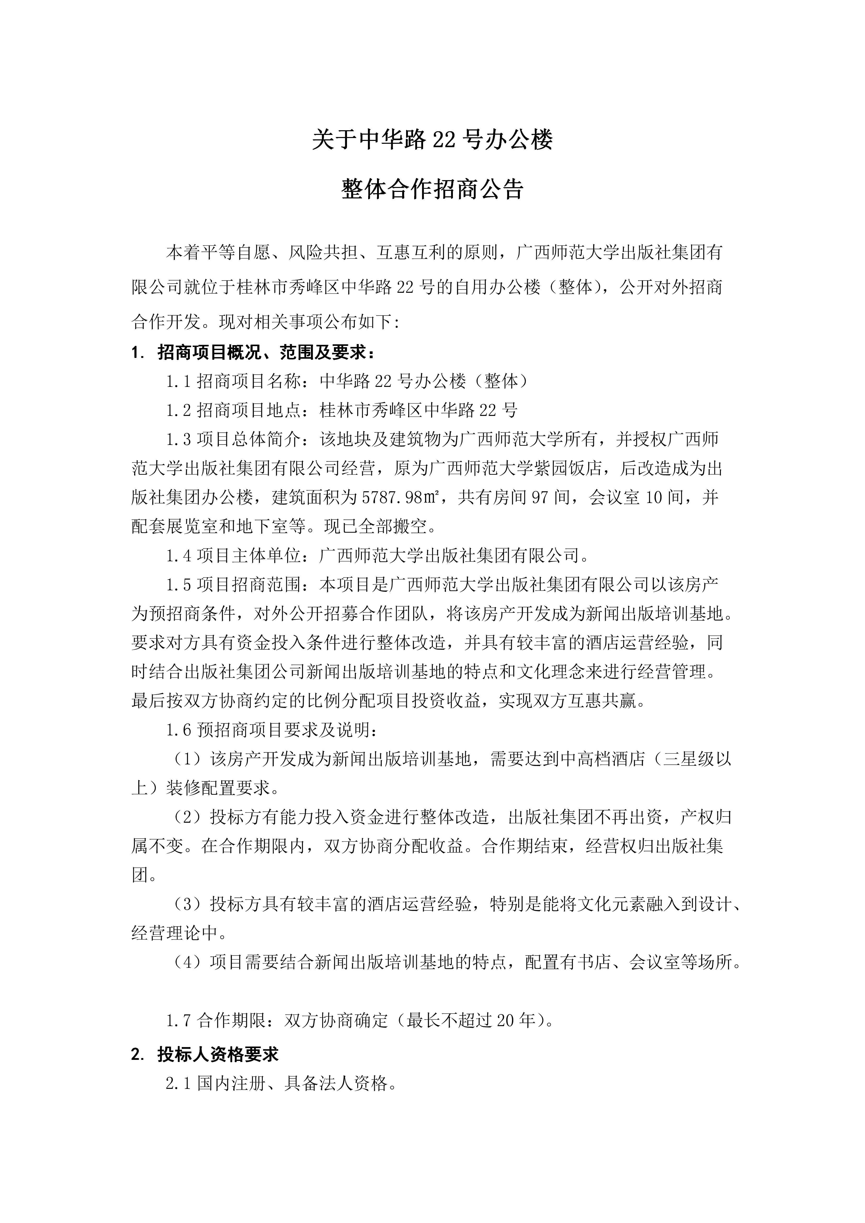 關(guān)于中華路22號辦公樓整體合作招商公告