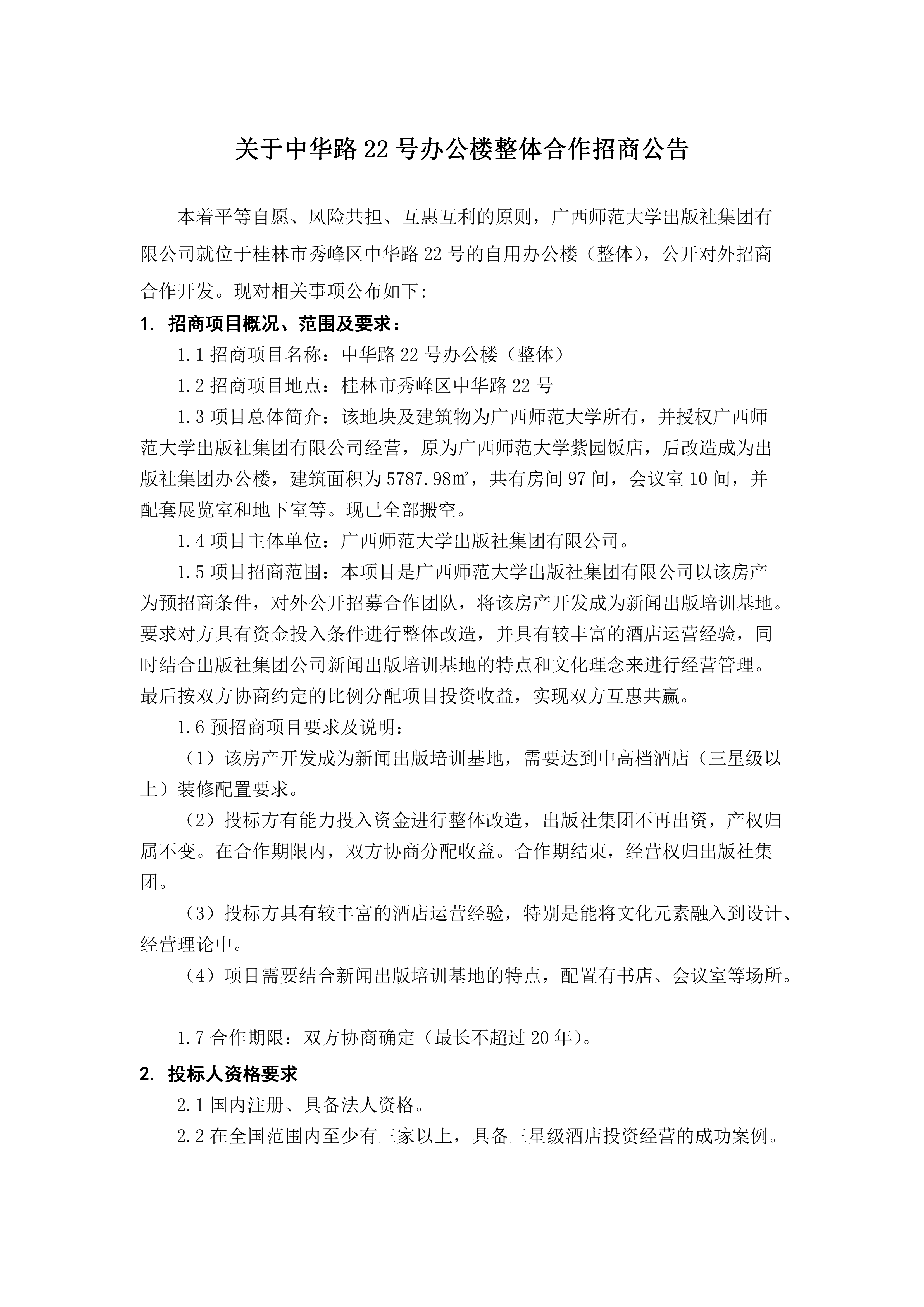 關(guān)于中華路22號辦公樓整體合作招商公告